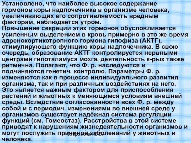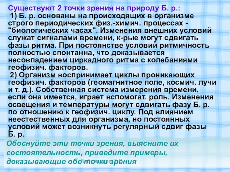 Внешние(экзогенные)-циклические изменения в окружающей среде, имеют геофизическую природу, связанную с вращением Земли. Пример: изменение солнечной активности, изменения активности и поведения организмов.