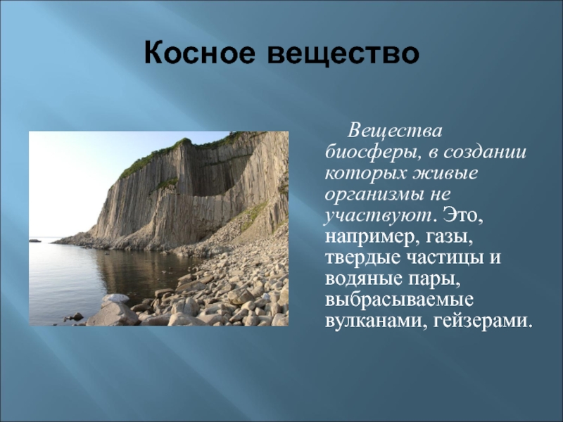 косное вещество — вещество неживой природы (песок, глина, гранит, базальт) формируется без участия живых организмов;