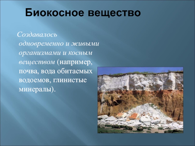 биокосное вещество — результат взаимодействия живых организмов с неживой природой (вода, почва, ил) т.е.создается живыми организмами вместе с неживой природой;