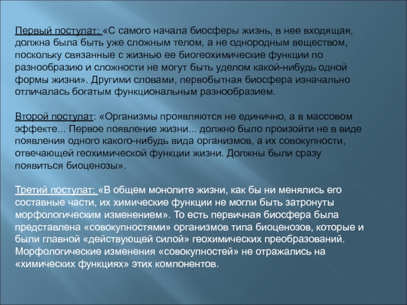 Третий постулат: «В общем монолите жизни, как бы ни менялись его составные части, их химические функции не могли быть затронуты морфологическим изменением». То есть первичная биосфера была представлена «совокупностями» организмов типа биоценозов, которые и были главной «действующей силой» геохимических преобразований. Морфологические изменения «совокупностей» не отражались на «химических функциях» этих компонентов.