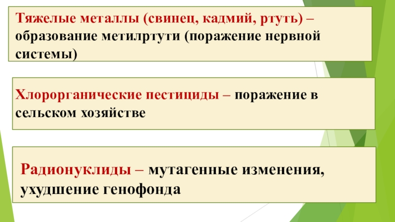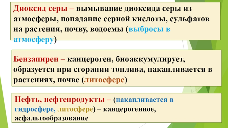 Нефть, нефтепродукты – (накапливается в гидросфере, литосфере) – канцерогенное, асфальтообразование