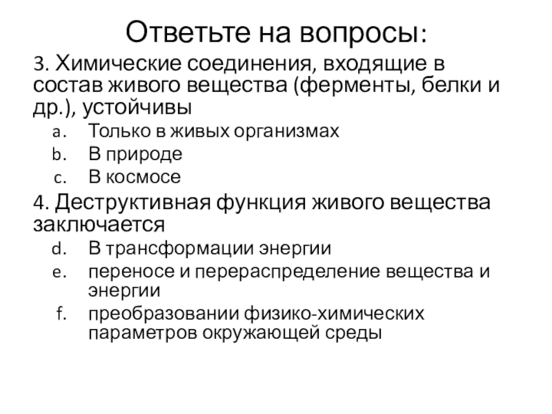 Химические соединения, входящие в состав живого вещества (ферменты, белки и др.), устойчивы только в живых организмах
