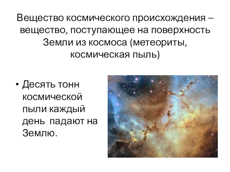 Слайд 13Вещество космического происхождения – вещество, поступающее на поверхность Земли из космоса