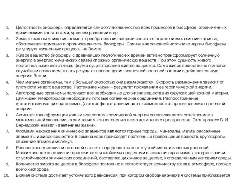 Слайд 19Целостность биосферы определяется самосогласованностью всех процессов в биосфере, ограниченных физическими константами,