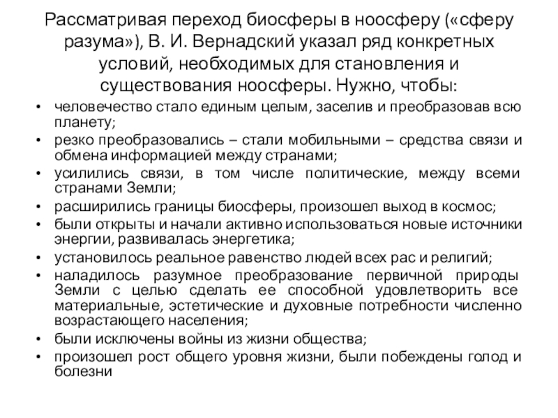 ряд конкретных условий, необходимых для становления и существования ноосферы. Нужно, чтобы: