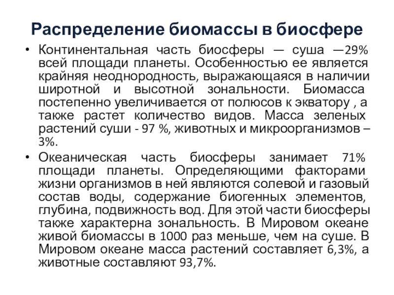 планеты. Особенностью ее является крайняя неоднородность, выражающаяся в наличии широтной и высотной зональности. Биомасса постепенно увеличивается от полюсов к экватору , а также растет количество видов. Масса зеленых растений суши - 97 %, животных и микроорганизмов – 3%.