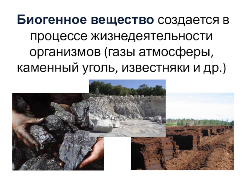 Слайд 8Биогенное вещество создается в процессе жизнедеятельности организмов (газы атмосферы, каменный уголь,