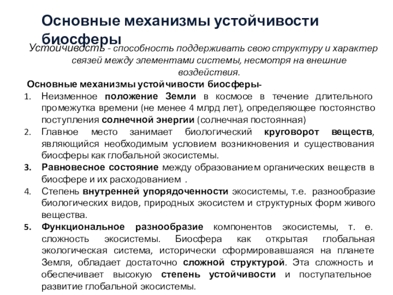 Функциональное разнообразие компонентов экосистемы, т. е. сложность экосистемы. Биосфера как открытая глобальная экологическая система, исторически сформировавшаяся на планете Земля, обладает достаточно сложной структурой. Эта сложность и обеспечивает высокую степень устойчивости и поступательное развитие глобальной экосистемы.