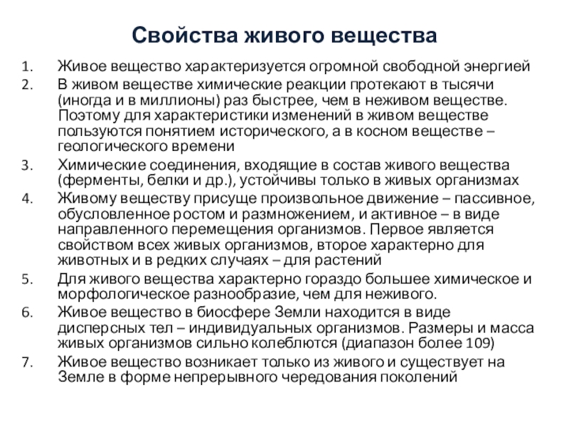 Живому веществу присуще произвольное движение – пассивное, обусловленное ростом и размножением, и активное – в виде направленного перемещения организмов. Первое является свойством всех живых организмов, второе характерно для животных и в редких случаях – для растений