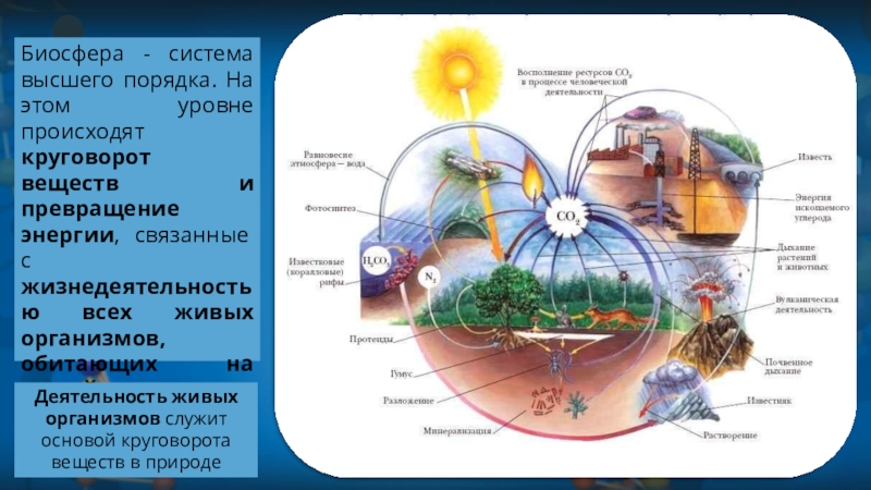 Биосфера - система высшего порядка. На этом уровне происходят круговорот веществ и превращение энергии, связанные с жизнедеятельностью всех живых организмов, обитающих на нашей планете