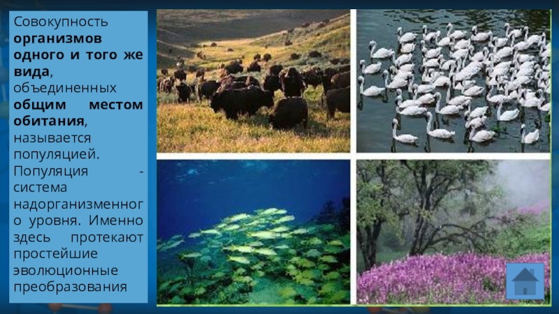 Совокупность организмов одного и того же вида, объединенных общим местом обитания, называется популяцией. Популяция - система надорганизменного уровня. Именно здесь протекают простейшие эволюционные преобразования