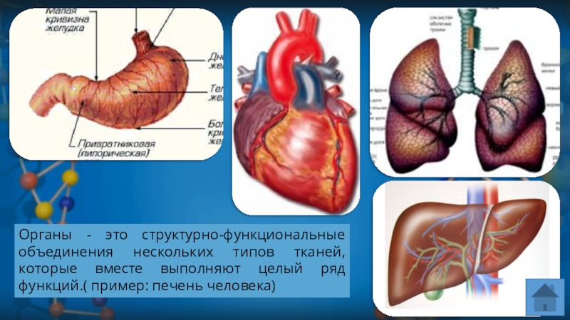 Органы - это структурно-функциональные объединения нескольких типов тканей, которые вместе выполняют целый ряд функций.( пример: печень человека)