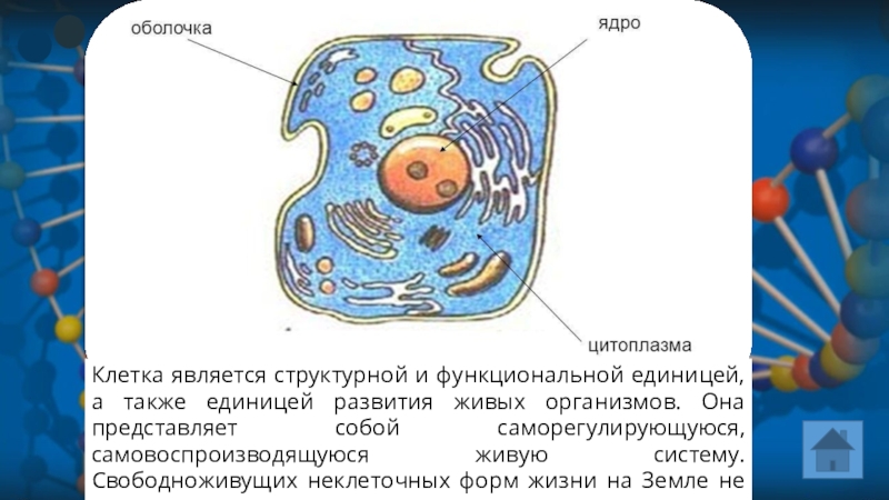 Клетка является структурной и функциональной единицей, а также единицей развития живых организмов. Она представляет собой саморегулирующуюся, самовоспроизводящуюся живую систему. Свободноживущих неклеточных форм жизни на Земле не существует