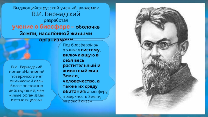 Под биосферой он понимал систему, включающую в себя весь растительный и животный мир Земли, человечество, а также их среду обитания: атмосферу, поверхность Земли, мировой океан