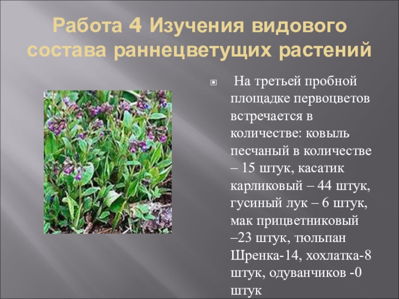 Слайд 16Работа 4 Изучения видового состава раннецветущих растений