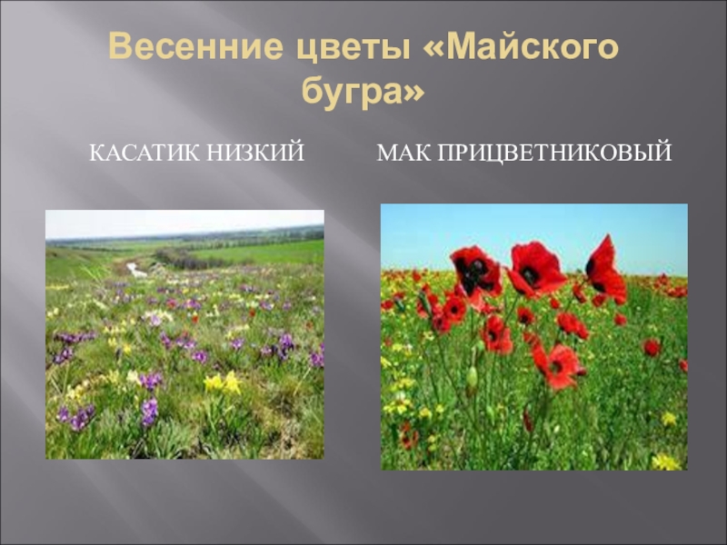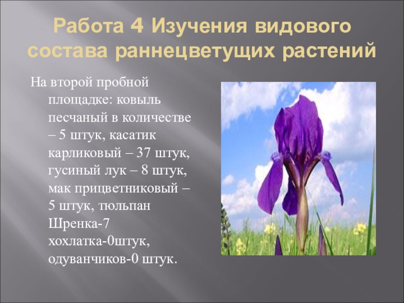 песчаный в количестве – 7 штук, касатик карликовый – 39 штук, гусиный лук – 1 штука, мак прицветниковый – 17 штук, тюльпан Шренка-29, хохлатка-0штук, одуванчиков 14 штук.
