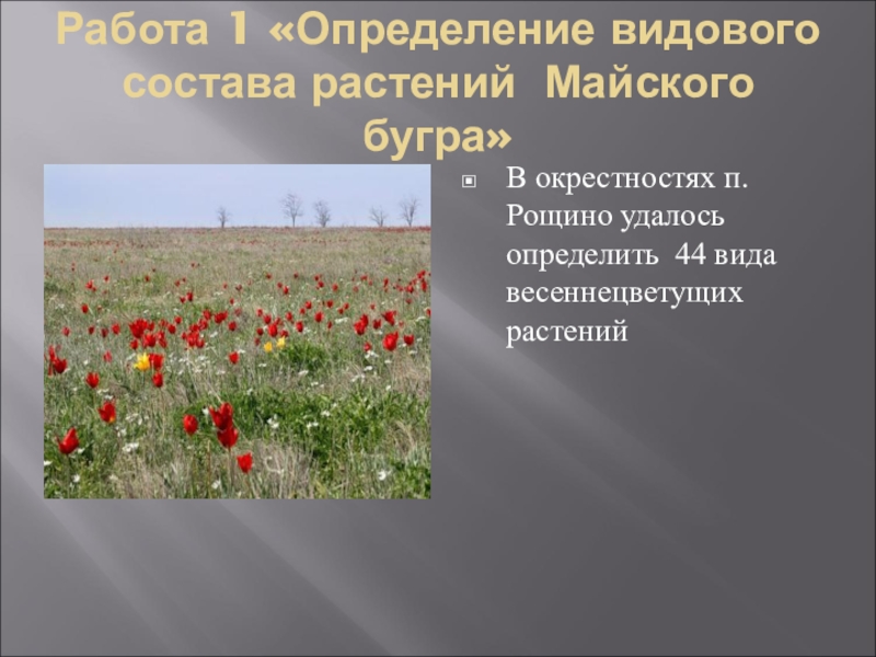 Слайд 10Работа 1 «Определение видового состава растений Майского бугра»