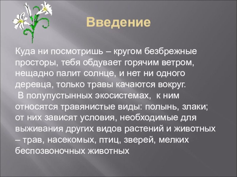 В полупустынных экосистемах, к ним относятся травянистые виды: полынь, злаки; от них зависят условия, необходимые для выживания других видов растений и животных – трав, насекомых, птиц, зверей, мелких беспозвоночных животных
