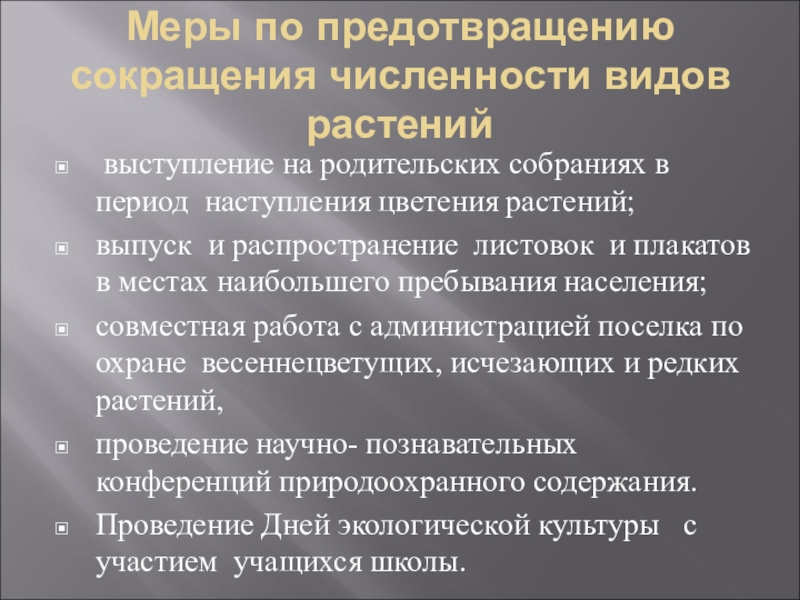 Слайд 19Меры по предотвращению сокращения численности видов растений
