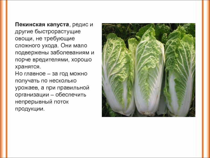 Слайд 7Пекинская капуста, редис и другие быстрорастущие овощи, не требующие сложного ухода.