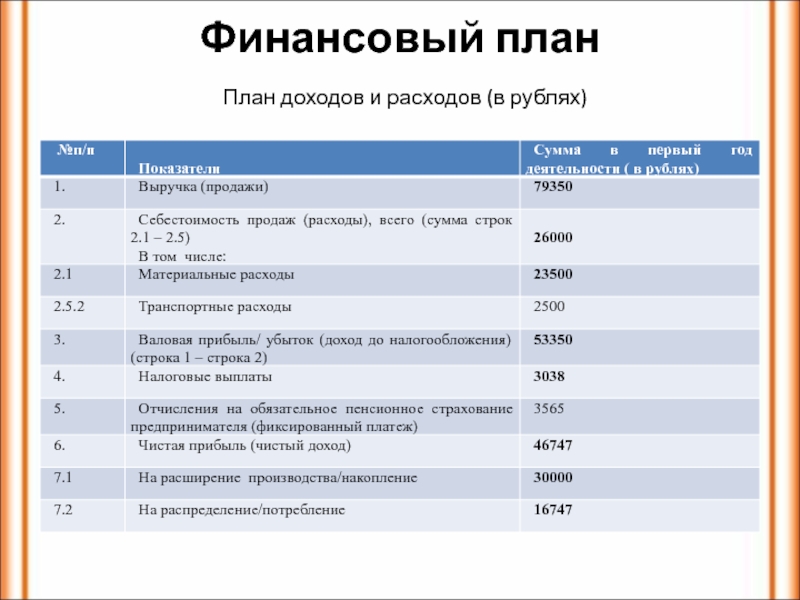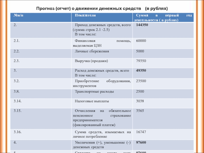 Слайд 17Прогноз (отчет) о движении денежных средств (в рублях)