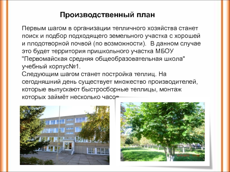 Предполагается открытие тепличного хозяйства на территории МБОУ "Первомайская средняя общеобразовательная школа", состоящего из двух теплиц общей площадью 50 квадратных метров каждая.