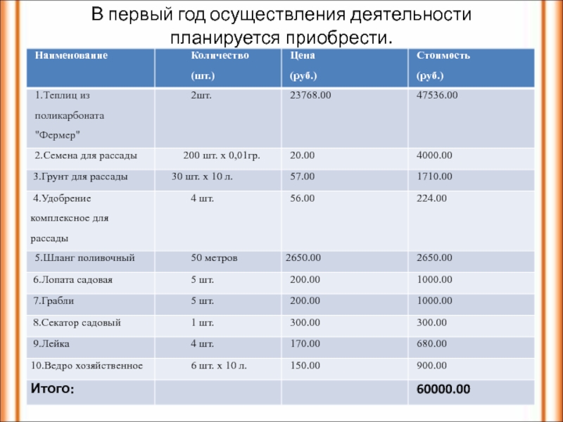 Слайд 15В первый год осуществления деятельности планируется приобрести.
