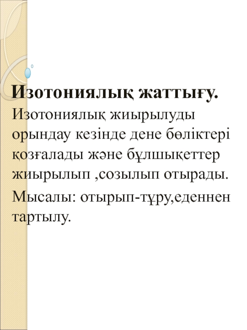 Изотониялық жаттығу.Изотониялық жиырылуды орындау кезінде дене бөліктері қозғалады және бұлшықеттер жиырылып ,созылып отырады. Мысалы: отырып-тұру,еденнен тартылу.
