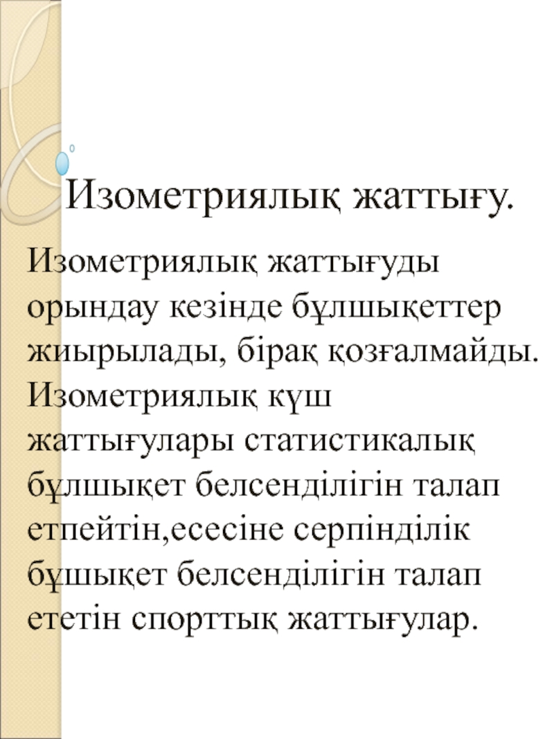 Изометриялық жаттығу.Изометриялық жаттығуды орындау кезінде бұлшықеттер жиырылады, бірақ қозғалмайды. Изометриялық күш жаттығулары статистикалық бұлшықет белсенділігін талап етпейтін,есесіне