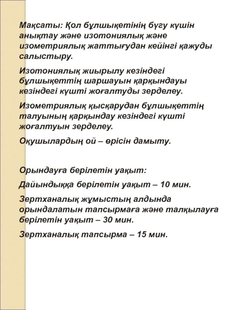 Мақсаты: Қол бұлшықетінің бүгу күшін анықтау және изотониялық және изометриялық жаттығудан кейінгі қажуды салыстыру.Изотониялық жиырылу кезіндегі бұлшықеттің шаршауын қарқындауы кезіндегі күшті жоғалтуды зерделеу. Изометриялық қысқарудан бұлшықеттің талуының қарқындау кезіндегі күшті жоғалтуын зерделеу.Оқушылардың ой – өрісін дамыту.Орындауға