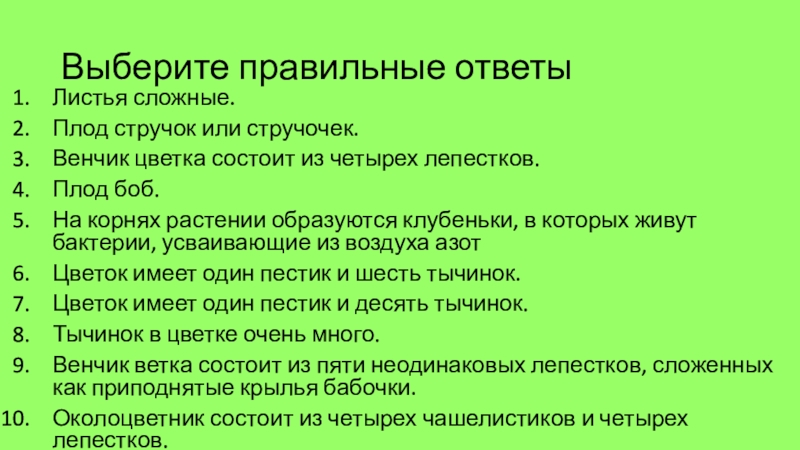 Выберите правильные ответыЛистья сложные.Плод стручок или стручочек.Венчик цветка состоит из четырех лепестков.Плод боб.На корнях растении образуются клубеньки,