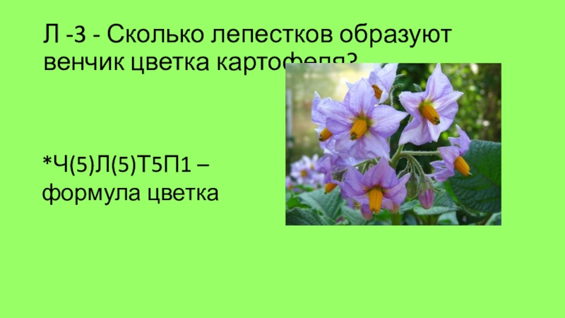Слайд 3Л -3 - Сколько лепестков образуют венчик цветка картофеля?