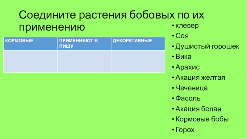 Соедините растения бобовых по их применениюклевер Соя Душистый горошекВика 	Арахис 	Акация желтаяЧечевица 	Фасоль 	Акация белаяКормовые бобы 	Горох