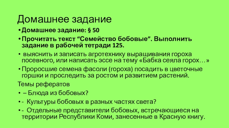 Домашнее заданиеДомашнее задание: § 50 Прочитать текст “Семейство бобовые”. Выполнить задание в рабочей тетради 125. выяснить и