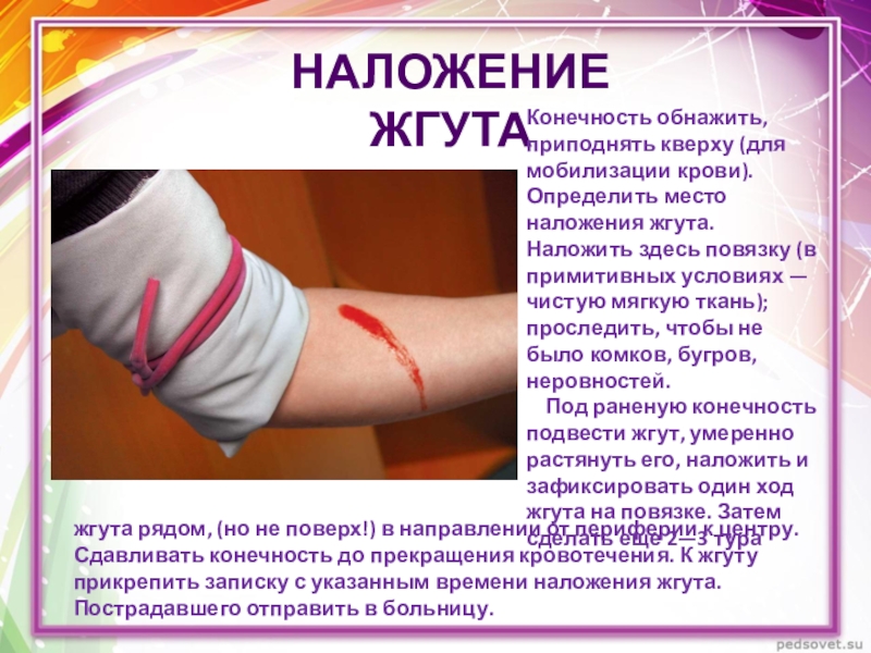 жгута рядом, (но не поверх!) в направлении от периферии к центру. Сдавливать конечность до прекращения кровотечения. К жгуту прикрепить записку с указанным времени наложения жгута. Пострадавшего отправить в больницу.