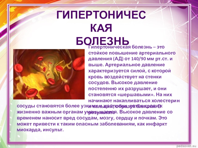 сосуды становятся более узкими и жесткими, поток крови к жизненно важным органам уменьшается. Высокое давление со временем наносит вред сосудам, мозгу, сердцу и почкам. Это может привести к таким опасным заболеваниям, как инфаркт миокарда, инсульт.