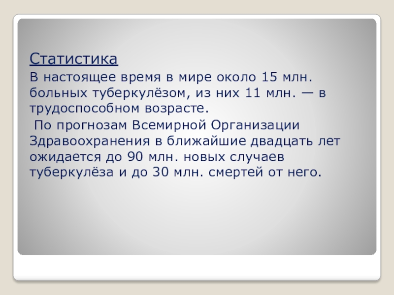 По прогнозам Всемирной Организации Здравоохранения в ближайшие двадцать лет ожидается до 90 млн. новых случаев туберкулёза и до 30 млн. смертей от него.