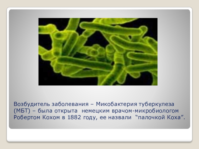 Слайд 5Возбудитель заболевания – Микобактерия туберкулеза (МБТ) – была открыта немецким врачом-микробиологом