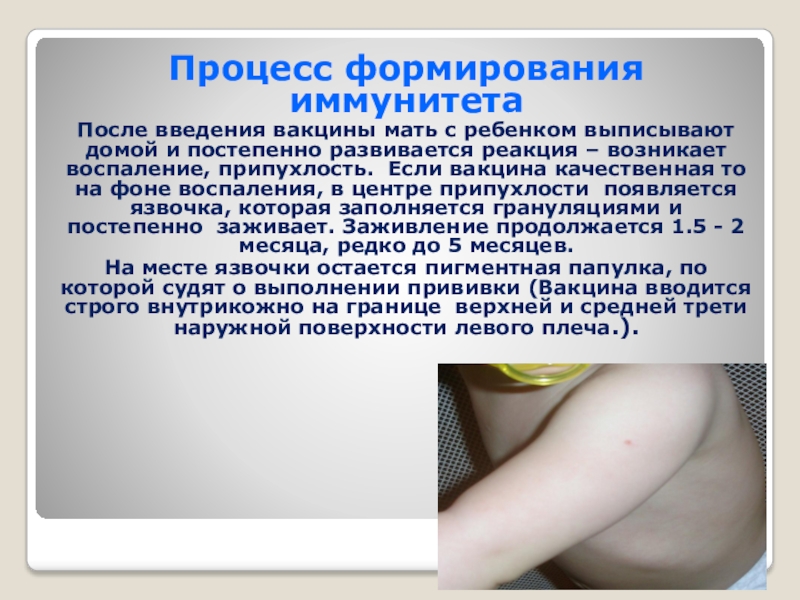 и постепенно развивается реакция – возникает воспаление, припухлость. Если вакцина качественная то на фоне воспаления, в центре припухлости появляется язвочка, которая заполняется грануляциями и постепенно заживает. Заживление продолжается 1.5 - 2 месяца, редко до 5 месяцев.