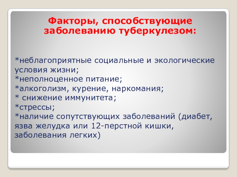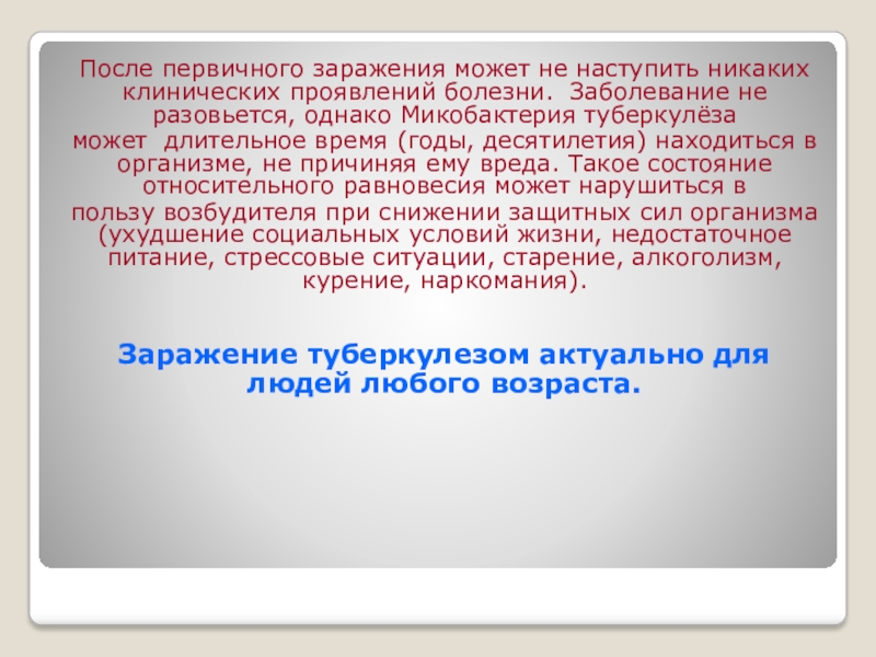 пользу возбудителя при снижении защитных сил организма (ухудшение социальных условий жизни, недостаточное питание, стрессовые ситуации, старение, алкоголизм, курение, наркомания).