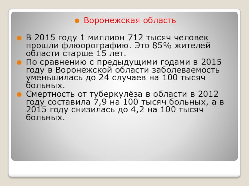 По сравнению с предыдущими годами в 2015 году в Воронежской области заболеваемость уменьшилась до 24 случаев на 100 тысяч больных.