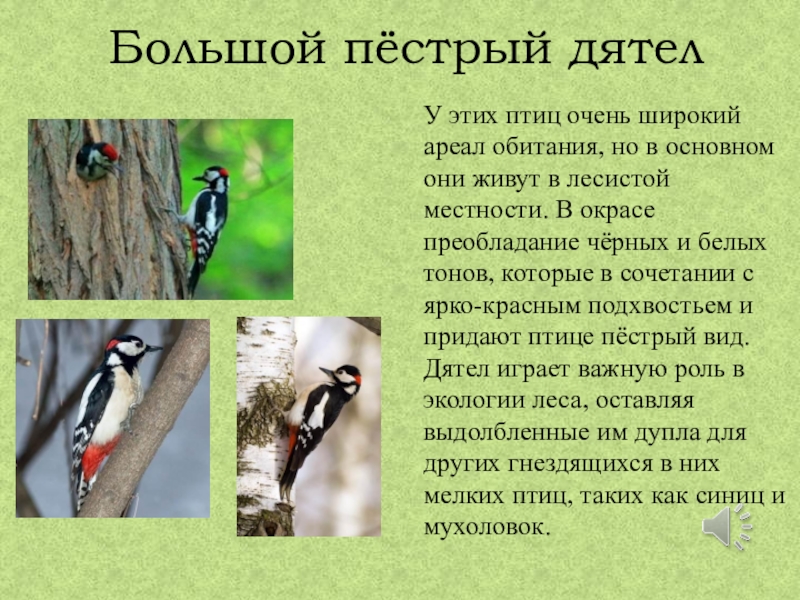 Большой пёстрый дятелУ этих птиц очень широкий ареал обитания, но в основном они живут в лесистой местности.