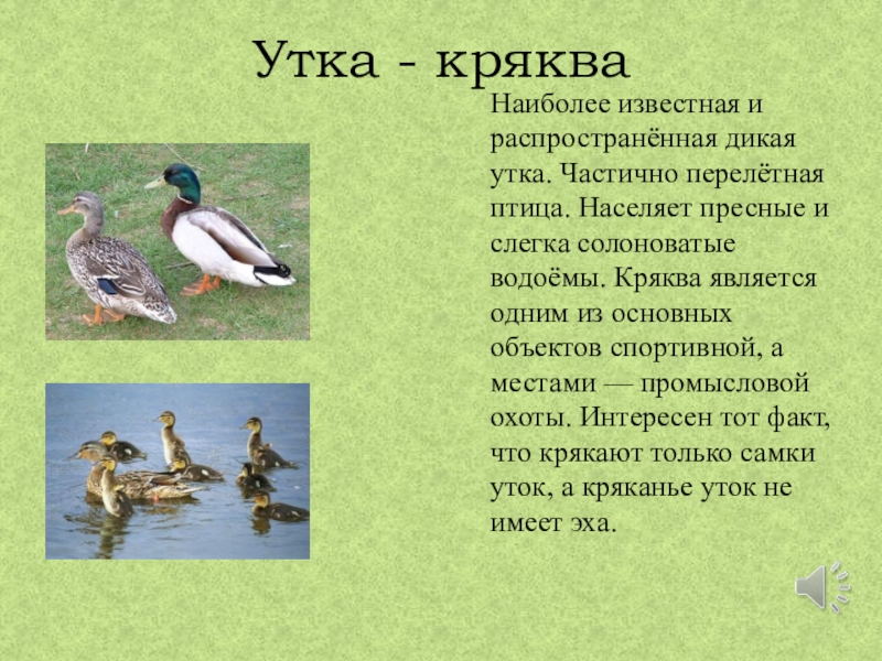 Утка - крякваНаиболее известная и распространённая дикая утка. Частично перелётная птица. Населяет пресные и слегка солоноватые водоёмы.