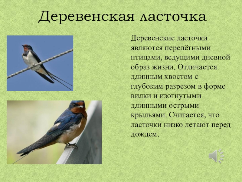 длинным хвостом с глубоким разрезом в форме вилки и изогнутыми длинными острыми крыльями. Считается, что ласточки низко летают перед дождем.