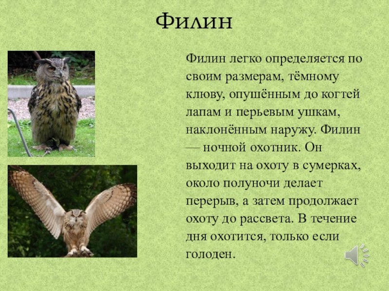 лапам и перьевым ушкам, наклонённым наружу. Филин — ночной охотник. Он выходит на охоту в сумерках, около полуночи делает перерыв, а затем продолжает охоту до рассвета. В течение дня охотится, только если голоден.
