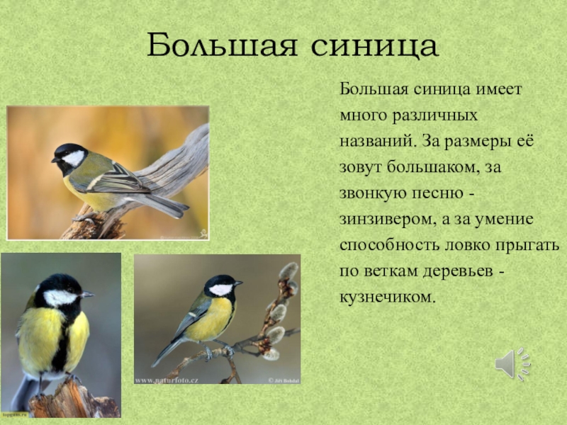 Большая синицаБольшая синица имеет много различных названий. За размеры её зовут большаком, за звонкую песню - зинзивером,