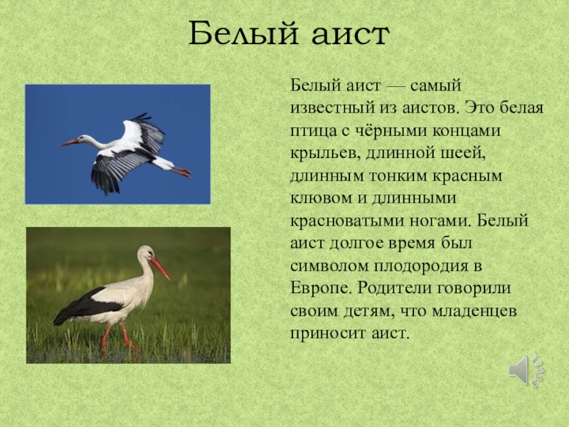 с чёрными концами крыльев, длинной шеей, длинным тонким красным клювом и длинными красноватыми ногами. Белый аист долгое время был символом плодородия в Европе. Родители говорили своим детям, что младенцев приносит аист.