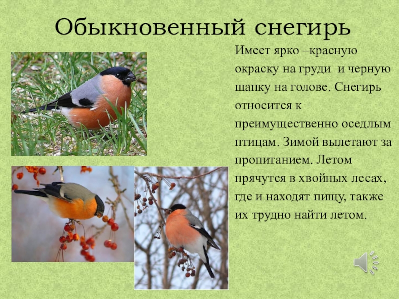 голове. Снегирь относится к преимущественно оседлым птицам. Зимой вылетают за пропитанием. Летом прячутся в хвойных лесах, где и находят пищу, также их трудно найти летом.