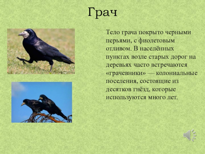 ГрачТело грача покрыто черными перьями, с фиолетовым отливом. В населённых пунктах возле старых дорог на деревьях часто
