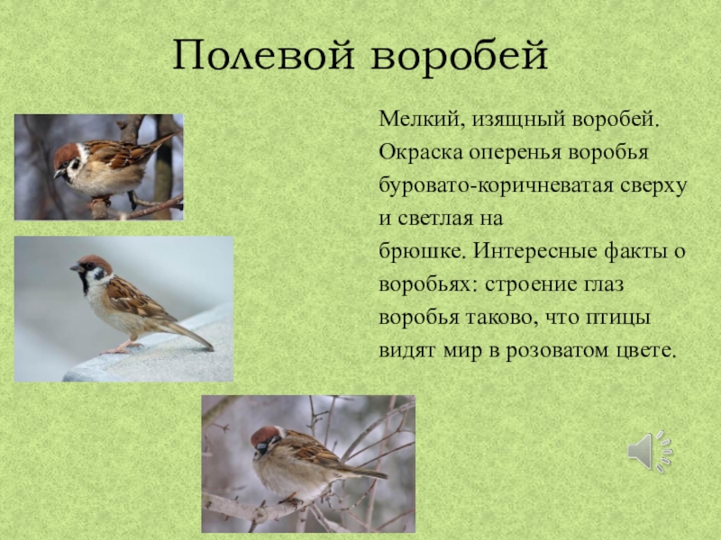 Полевой воробейМелкий, изящный воробей. Окраска оперенья воробья буровато-коричневатая сверху и светлая на брюшке. Интересные факты о воробьях: строение